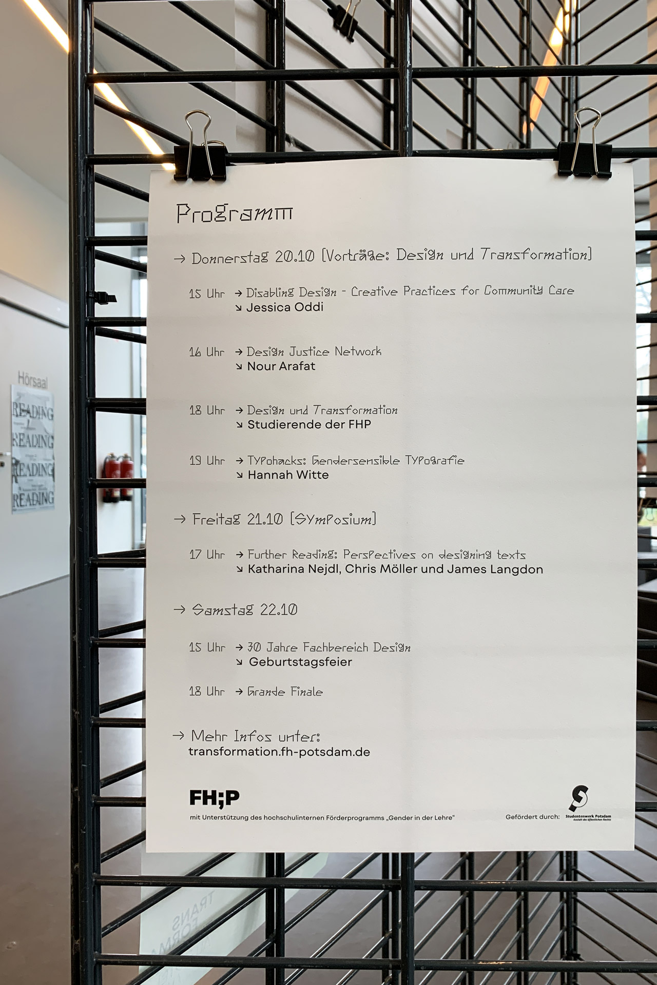 Die Ausstellung wurde ergänzt durch Vorträge zu Design und Transformation sowie durch das Symposium „Further Reading: Perspectives on designing texts“. Zudem war die Veranstaltung auch eine Geburtstagsfeier: der Fachbereich feierte seine 30 Jahre Bestehen mit 30 von Studierenden gebackene Kuchen und einer langen Tafel im Foyer des Hauses.