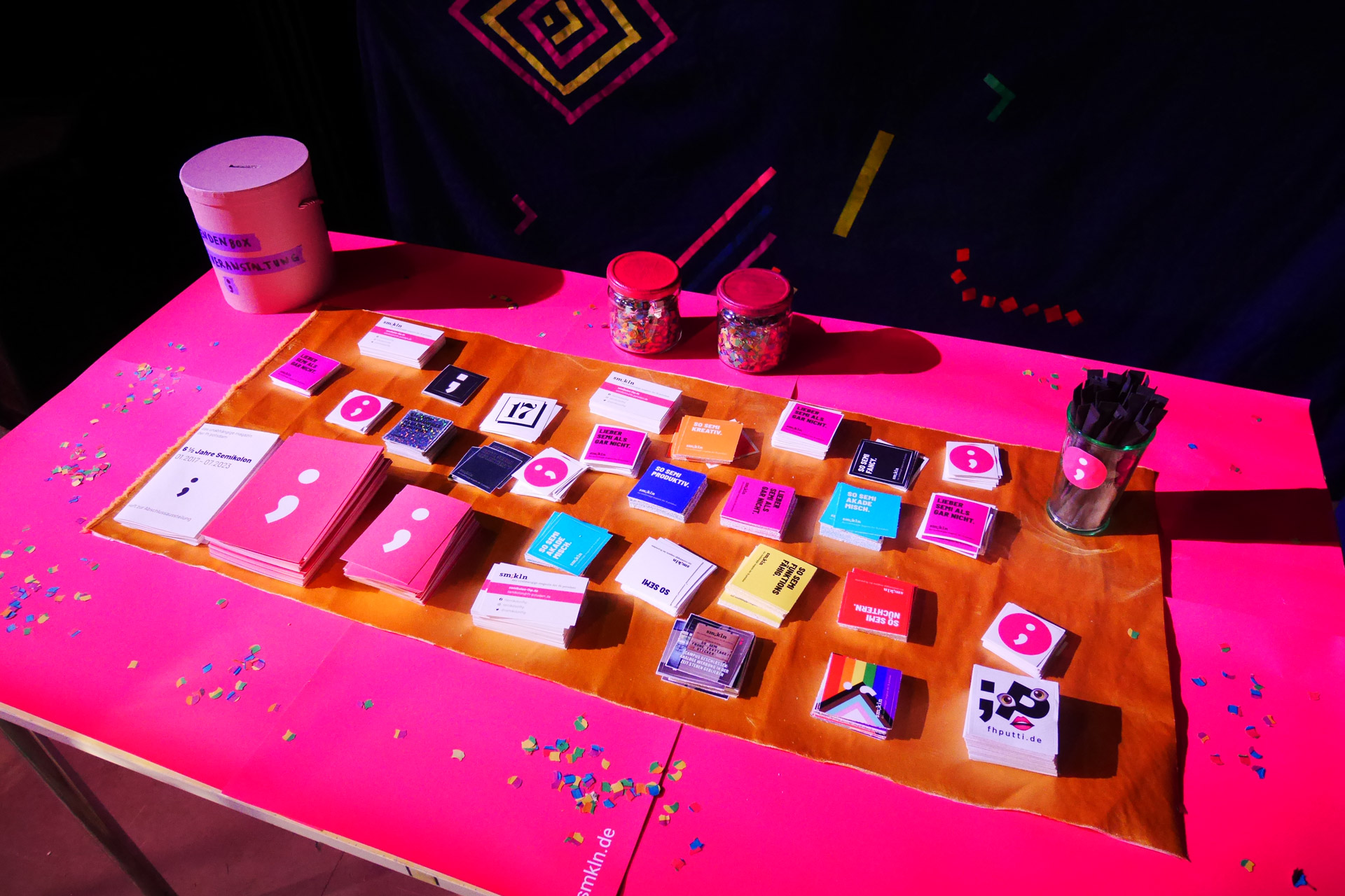 Wir sind natürlich auch traurig darüber, dass wir aufhören, keine Frage. Die 6 ½ Jahre-Feier war ein rundum gelungener Abschluss für Semikolon und seine Redaktionsmitglieder – aktuelle wie ehemalige – und für die Freund:innen des Online-Magazins. Diese konnten uns an der Pinnwand auf Zettelchen Abschiedsnachrichten hinterlassen, quasi ein horizontales Gästebuch, das sehr gut angenommen wurde. Außerdem erreichten uns viele Mails von Hochschulangehörigen, die nicht an der Feier teilnehmen konnten. Über die vielen lieben Nachrichten haben wir uns sehr gefreut.