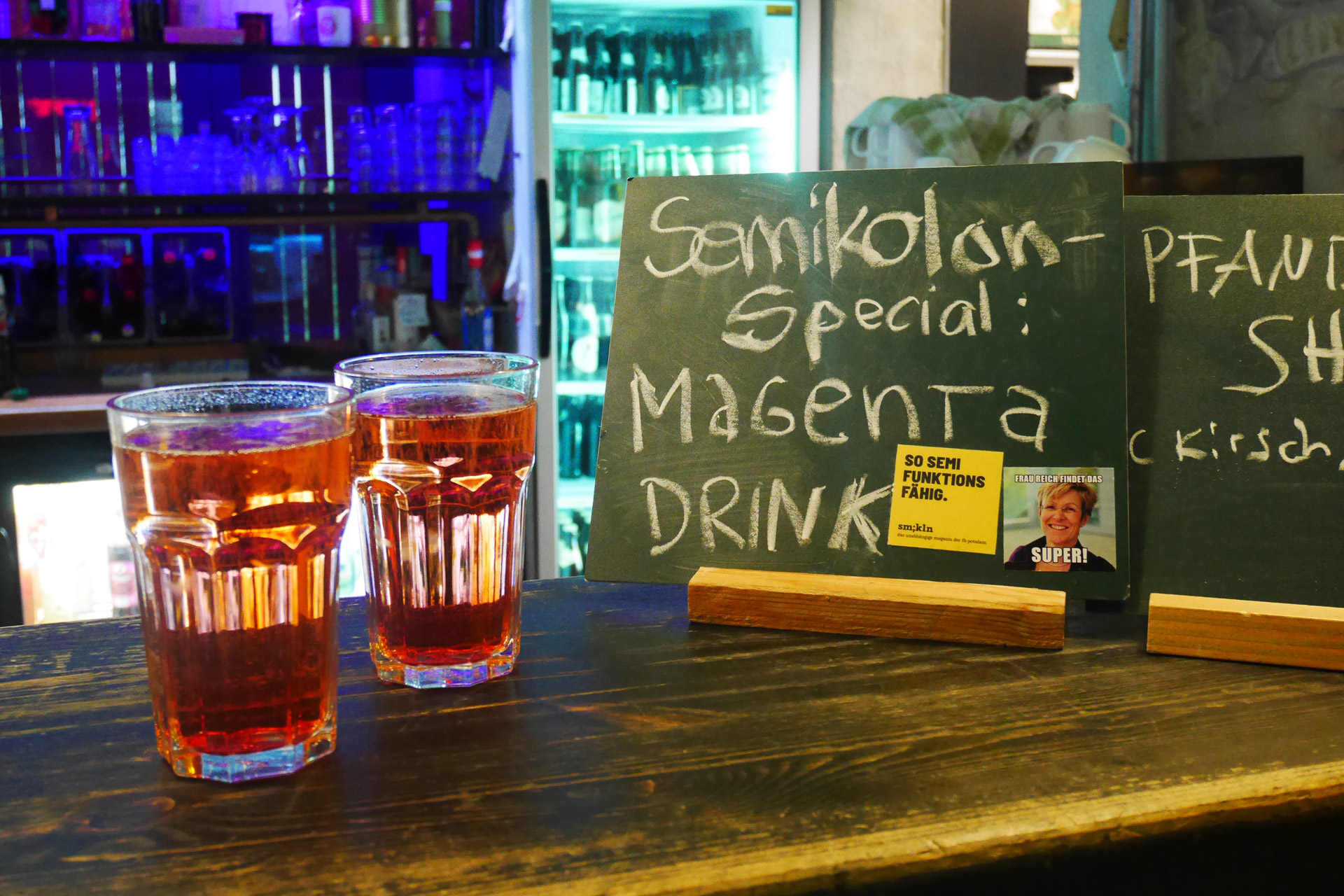 Um 18 Uhr ging es los. Damit wir nicht einfach eine Stunde Programm haben, haben wir uns dafür entschieden, kleine Programmpunkte mit 20 Minuten Pausen dazwischen zu machen, damit sich die Ausstellung angeschaut oder ein neues Magenta-Getränk am Tresen geholt werden konnte. Nach der Begrüßung ging es weiter mit einem „Spiel“: dem großen Semikolon-Beitragsbilderraten, moderiert von den Gründer*innen vom Semipodcast Sophia und Christian, Elisa die den Podcast weitergeführt hat, war auch mit dabei.
